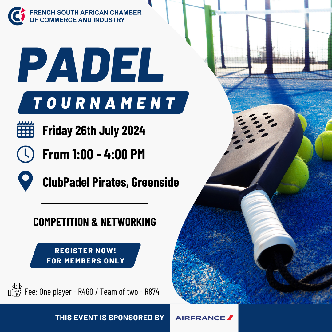 The French South African Chamber of Commerce and Industry (FSACCI) is thrilled to announce the launch of its Padel Tournament to be held every quarter, bringing together members for an afternoon of competition and networking.