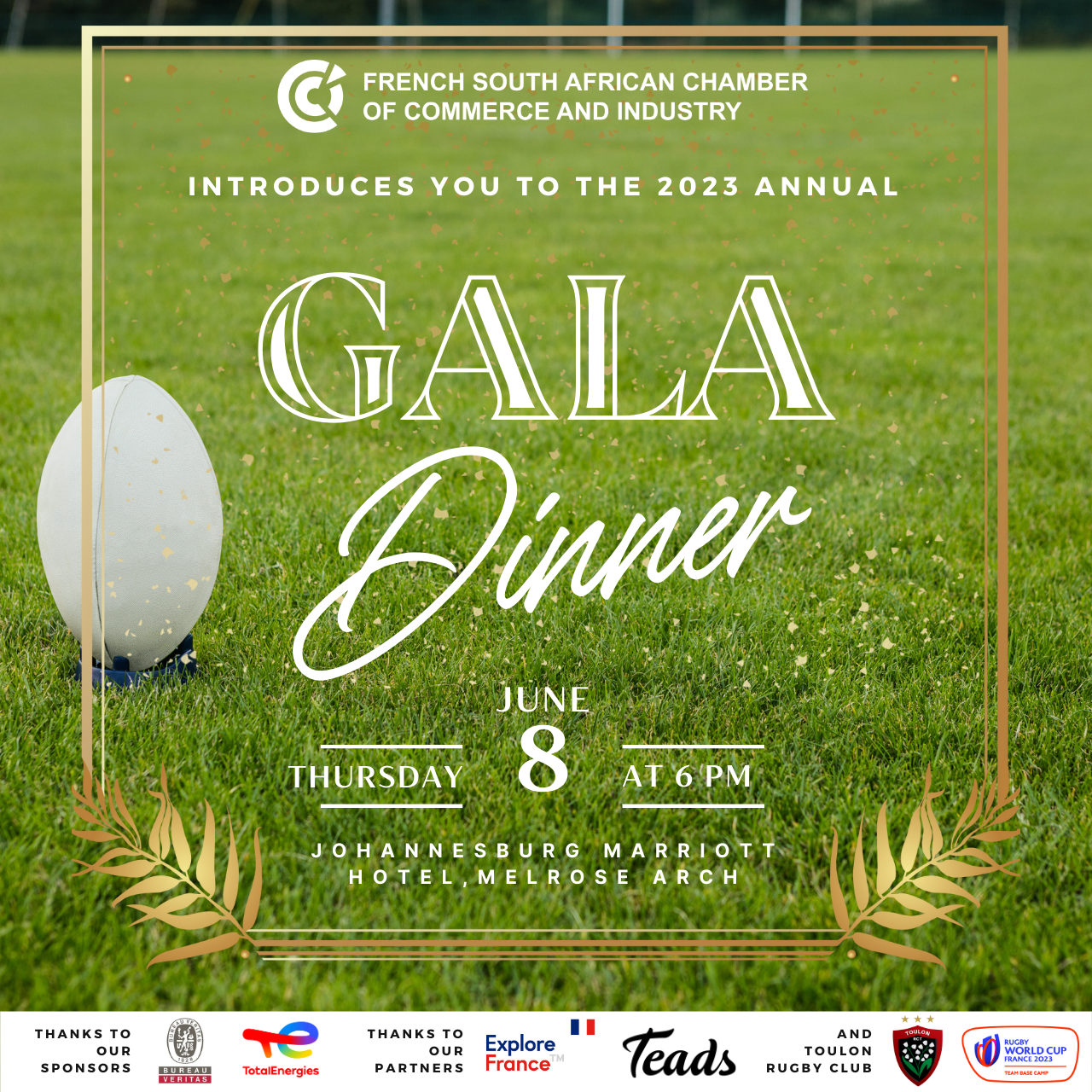 In celebration of the 2023 Rugby World Cup in France, join the French South African Chamber of Commerce & Industry for a wonderful Gala Dinner on Thursday 8th June 2023 in Johannesburg with the presence of Toulon Rugby Club (RCT) for a lovely celebration between France and South Africa.