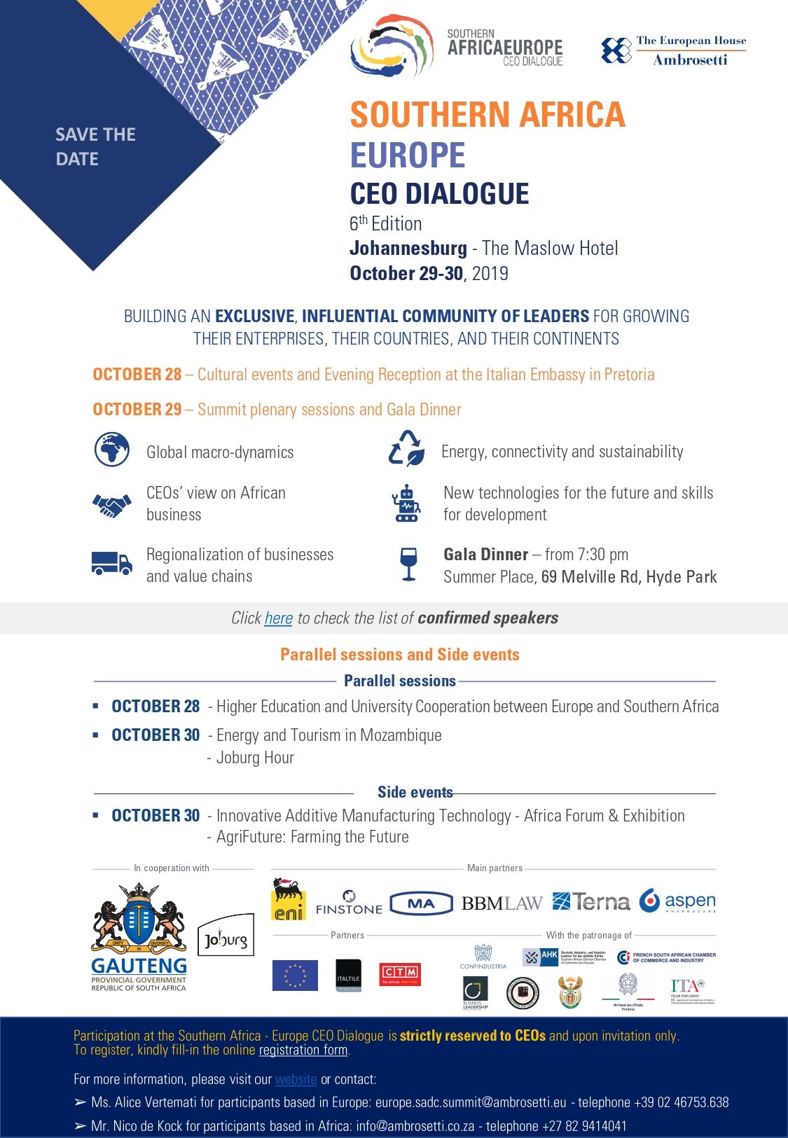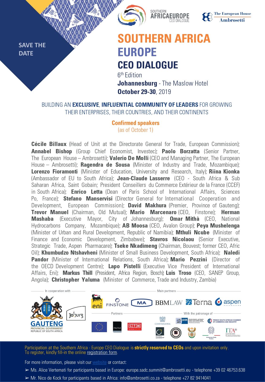 “Southern Africa Europe CEO Dialogue”, taking place at the Maslow Hotel in Sandton on 29-30 October 2019.
