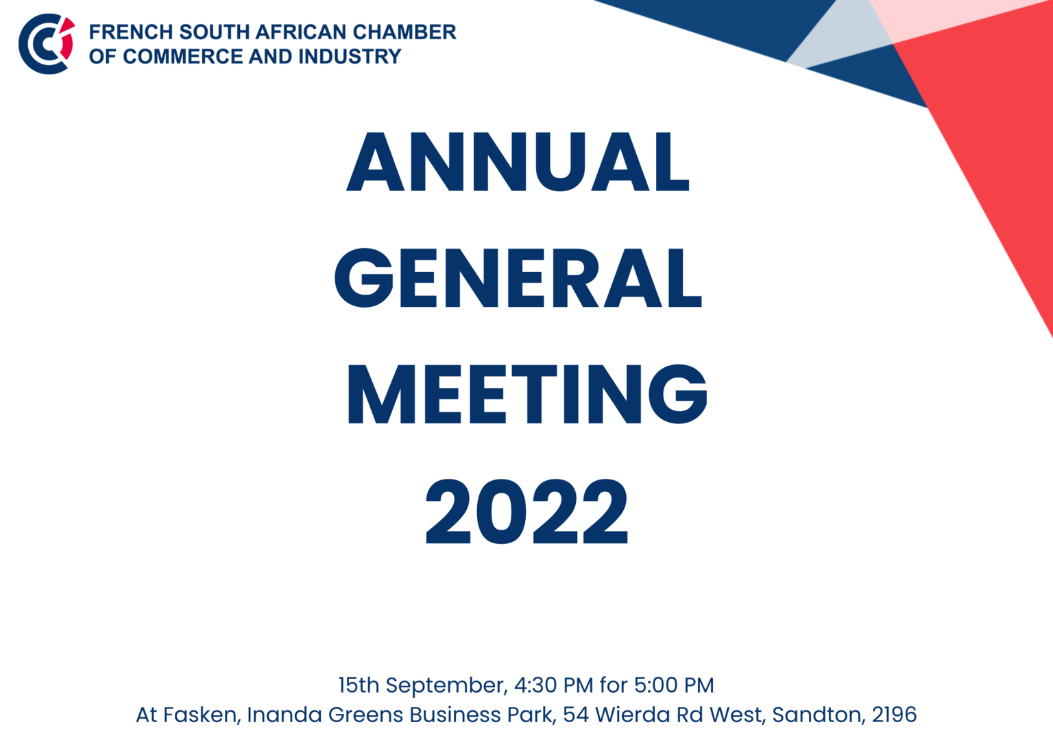The French South African Chamber of Commerce and Industry (FSACCI) is pleased to invite all its members, in good standing, to take part in our upcoming AGM.