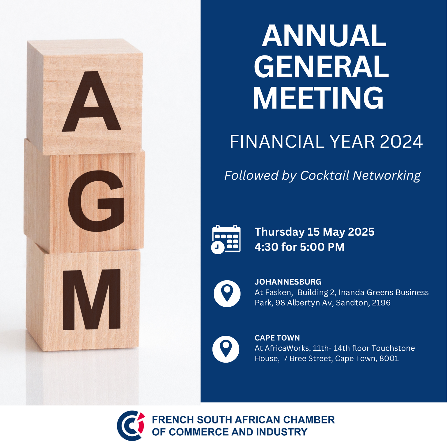 The French South Africa Chamber of Commerce and Industry (FSACCI) invites all its members in good standing to take part in the upcoming Annual General Meeting (AGM) on Thursday 15 May 2025.