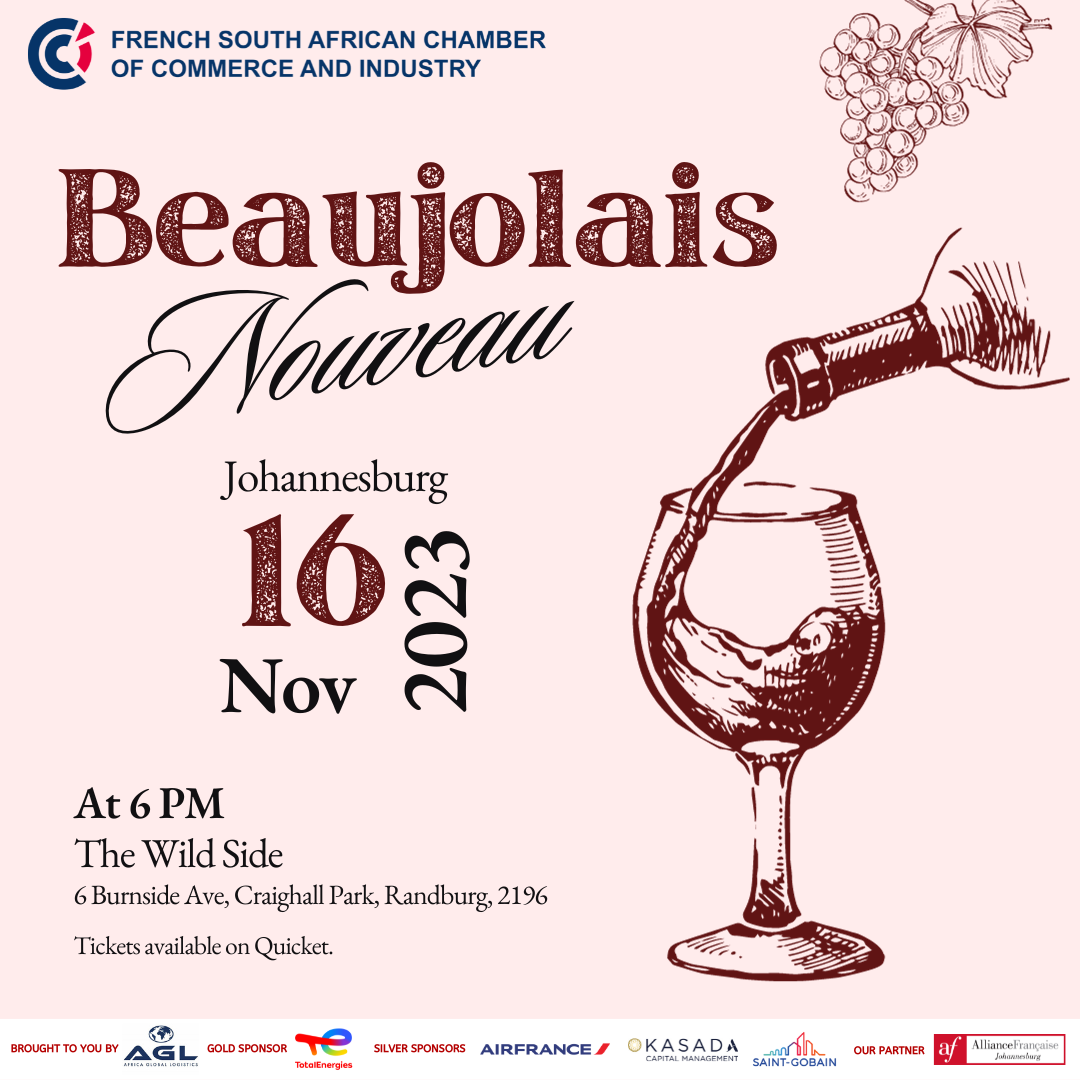 The Annual Beaujolais Nouveau will take place on Thursday 16th November 2023. It is a great opportunity for French and South Africa business communities to make valuable contacts.