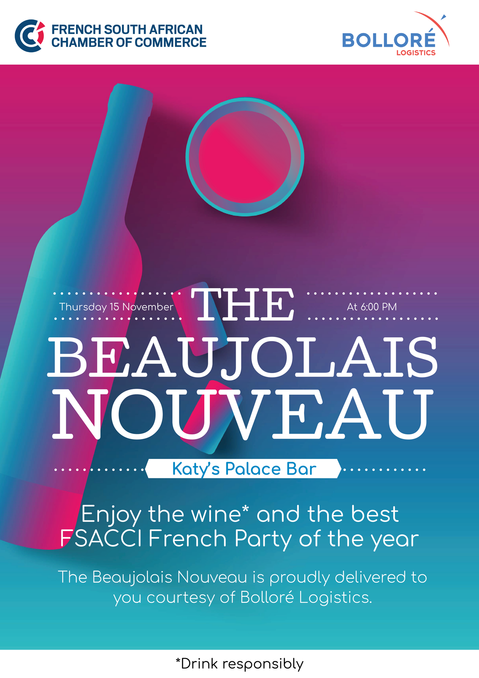 REGISTER NOW ! ONLY A FEW SEATS LEFT. The French South African Chamber of Commerce & Industry (FSACCI) is celebrating the ritual that is the worldwide arrival of the ‘Beaujolais Nouveau’, every 3rd Thursday of the month of November. On the program will be wine and cheese tasting, and, more importantly networking among our members and friends. 500 people are expected for this festive event at Katy's Palace Bar.