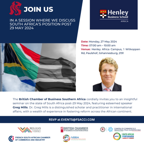 The French South African Chamber of Commerce & Industry, along with the British Chamber of Business Southern Africa cordially invites you to an insightful seminar on the state of South Africa post-29 May 2024, featuring esteemed speaker Dr. Greg Mills a distinguished scholar and practitioner in international affairs, with a wealth of experience in fostering reform across the African continent.