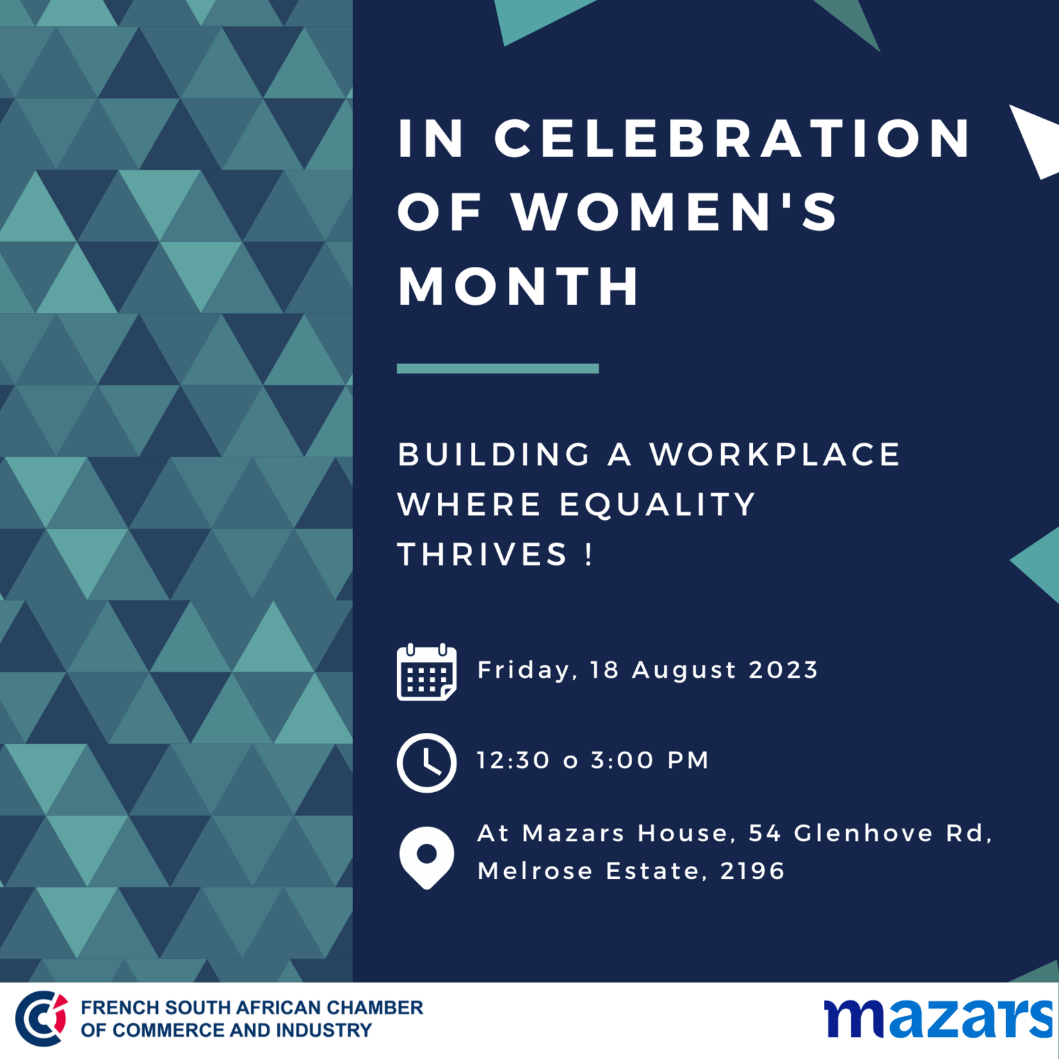 In celebration of Women's Month, the French South African Chamber of Commerce and Industry, in partnership with Mazars, are thrilled to announce an enriching discussion and networking opportunity, complimented by delectable culinary delights, and exciting gifts.