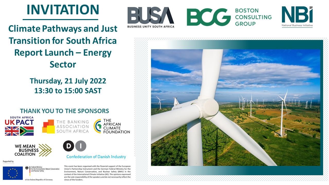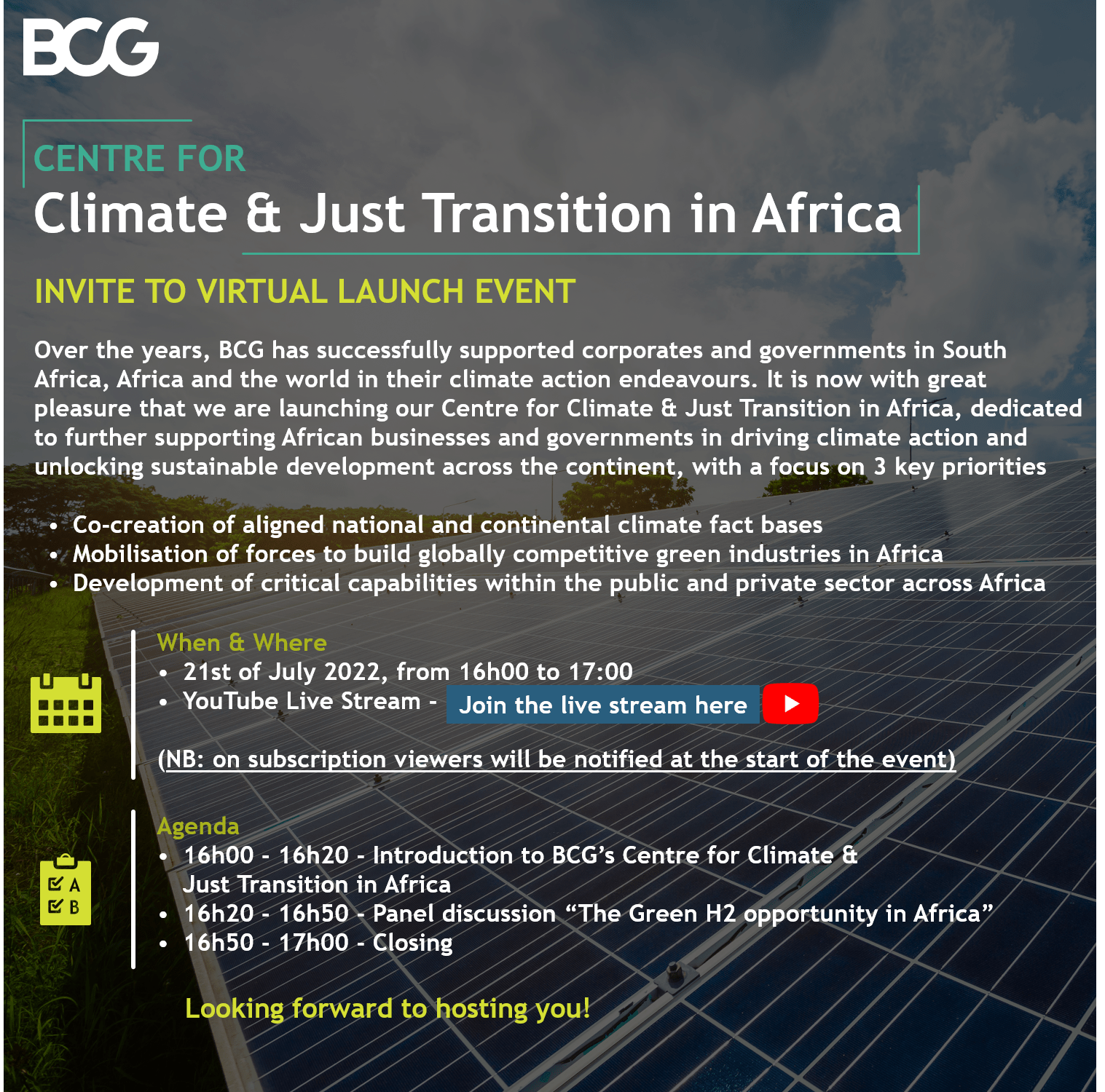 BCG will be hosting 2 events on July 21, Climate pathways and Just Transition for SA report as well as BCG’s Centre for Climate and Just Transition