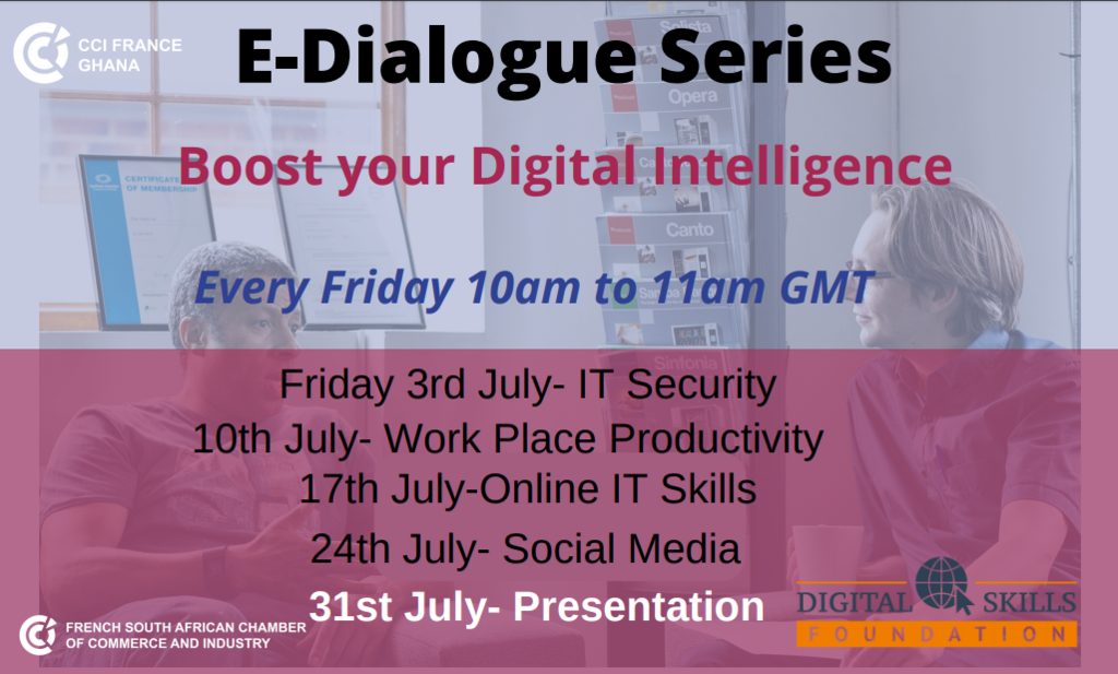 French South African Chamber of Commerce and Industry and CCI France Ghana in collaboration with the Digital Skills Foundation are organizing a 5-Week E-Dialogue Series dealing with one topic every week over an hour.