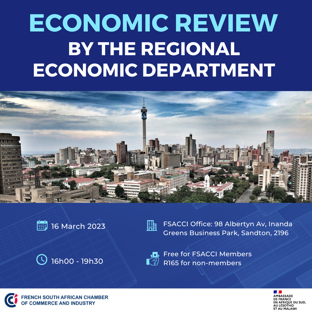 On Thursday 16th March the French South African Chamber of Commerce & Industry will host an Economic Review by the Regional Economic Department of the French Embassy in South Africa from 16h30 to 19h30 at the FSACCI office.