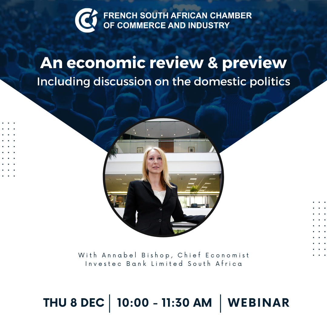 The French South African Chamber of Commerce & Industry is pleased to invite you to the webinar the Economic review & preview - Including discussion on the domestic politics presented by Annabel Bishop, Chief Economist at Investec Bank Limited South Africa on Thursday, 8 December from 10:00 to 11:30.
