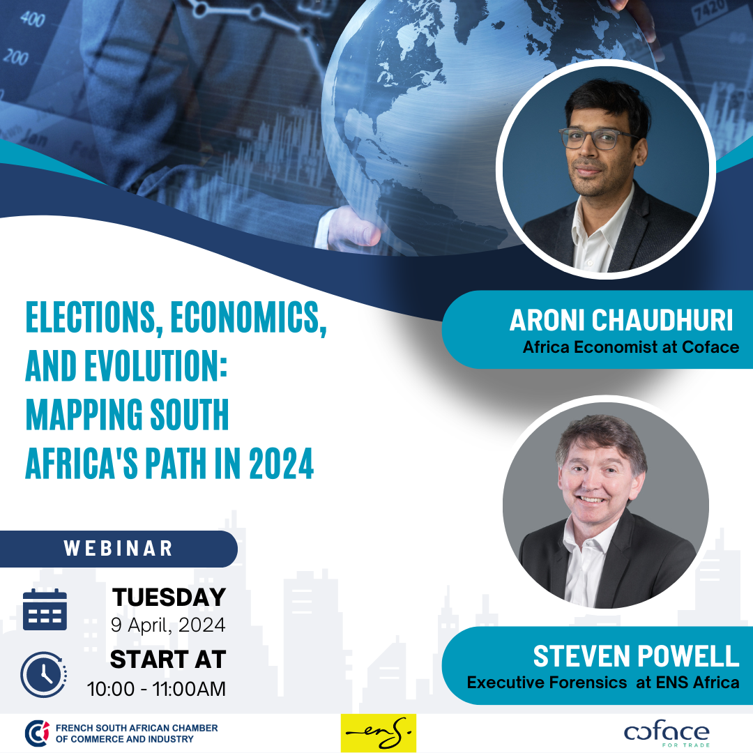 Join the French South African Chamber of Commerce & Industry in collaboration with its platinum members Coface and ENS Africa for the next webinar to talk about South Africa's path to 2024.
