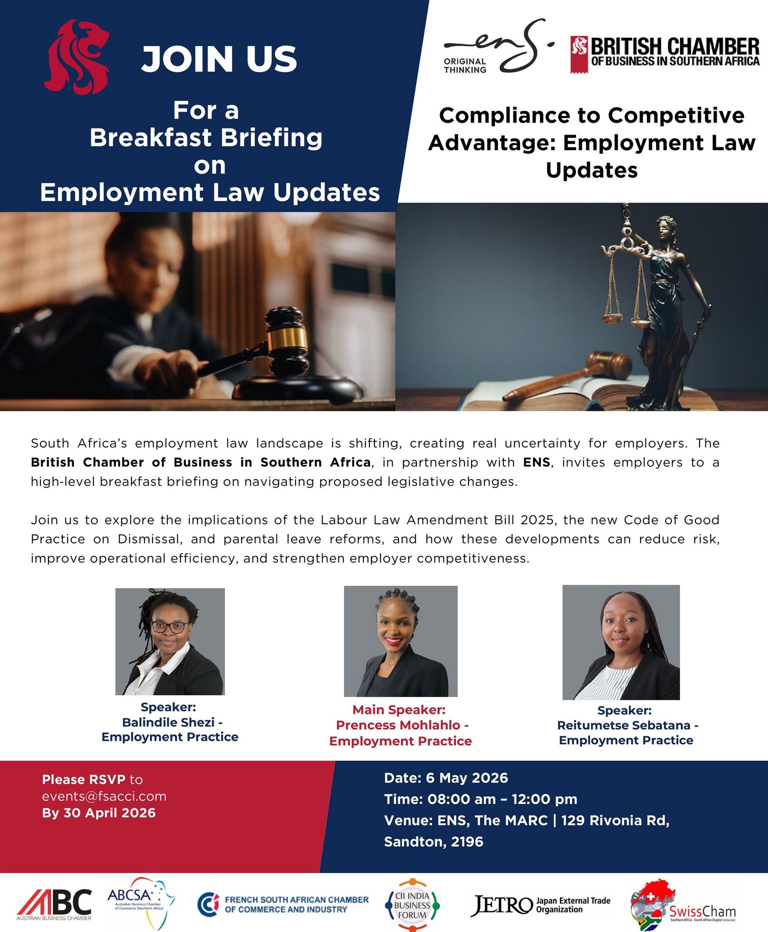 You are cordially invited to an exclusive Briefing on Employment Law Updates, hosted by the British Chamber of Business in Southern Africa, in partnership with ENS and leading international chambers.