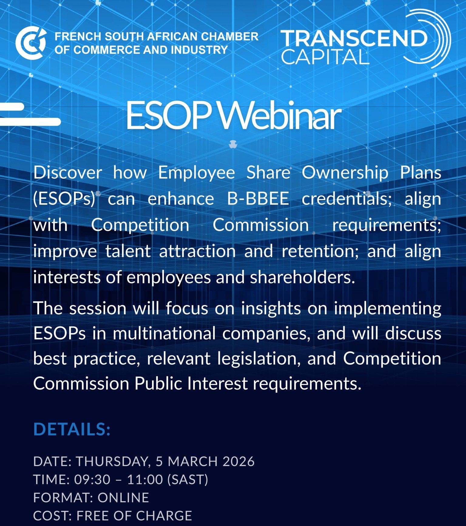 The French South African Chamber of Commerce and Industry (FSACCI) is hosting a webinar on Employee Share Ownership Plans (ESOPs) in collaboration with Transcend Capital, a FSACCI member and specialist ESOP advisory firm.