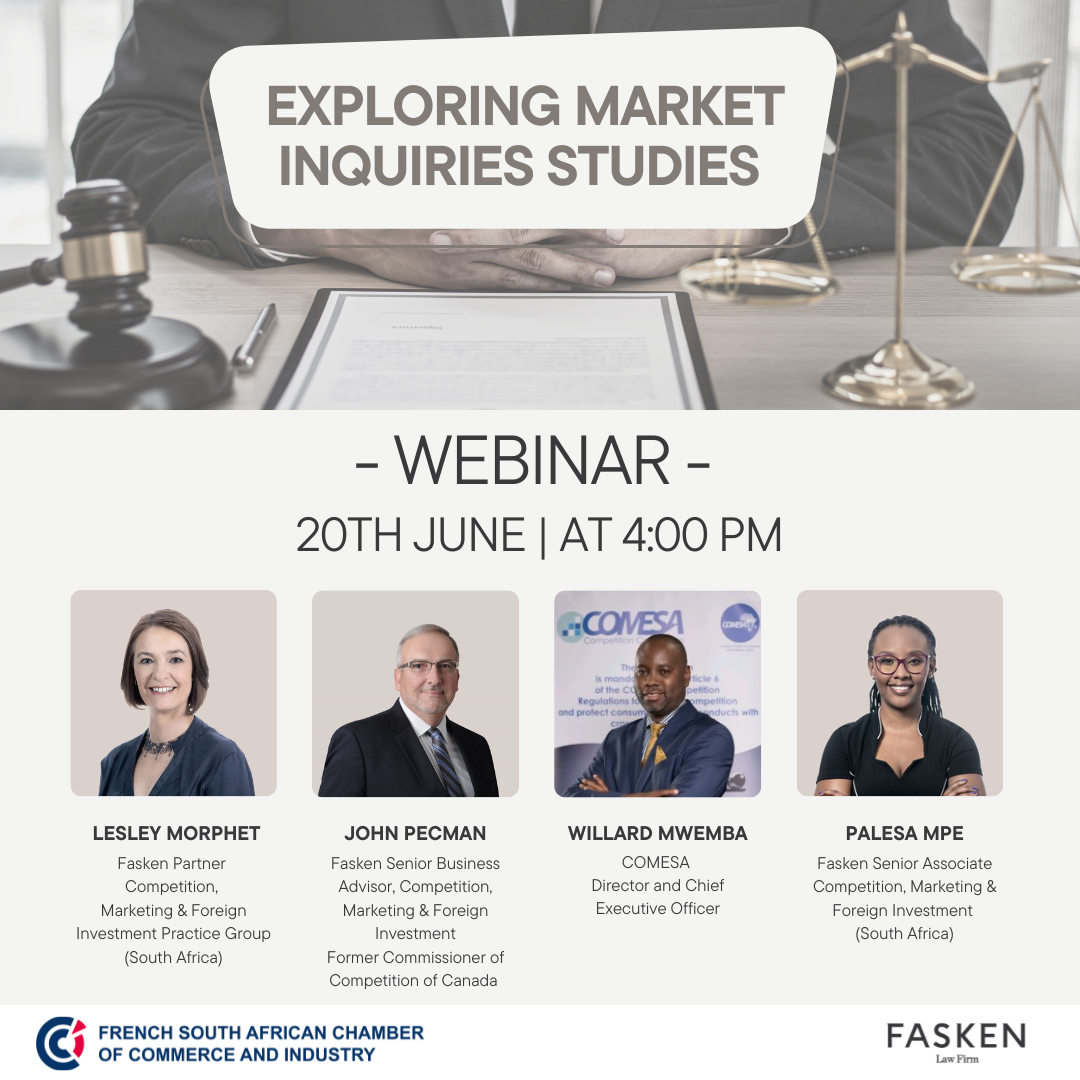 The French South African Chamber of Commerce & Industry (FSACCI) along with its member Fasken have joined forces to offer an insightful webinar to explore Market Inquiries in Competition Law.
