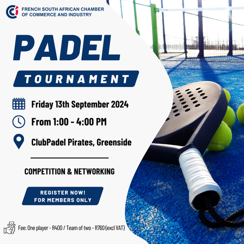 The French South African Chamber of Commerce and Industry (FSACCI) is thrilled to announce the hosting of its second Padel Tournament, bringing together members for an afternoon of competition and networking!