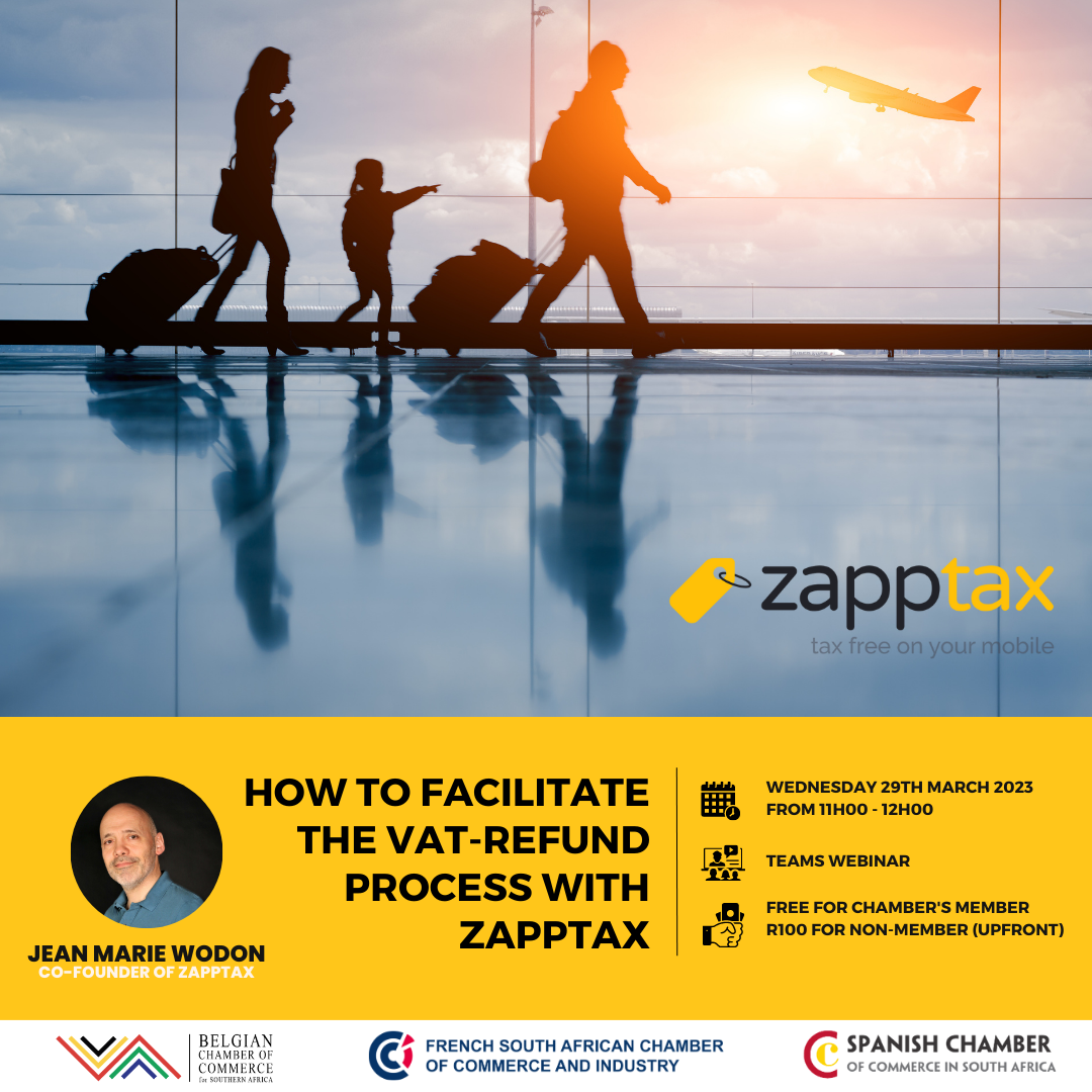 Join us on Wednesday, 29th March with Jean-Marie Wodon, co-founder of Zapptax for an introduction to Zapptax to learn more about VAT refund on purchases made in the EU and taken home to South Africa.