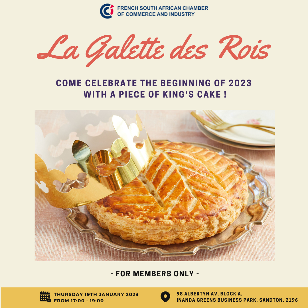 We would be delighted to see you for the traditional "Galette des Rois" – called the King’s cake on Thursday, January 19th from 5:00 to 7:00 pm at the Johannesburg FSACCI office.