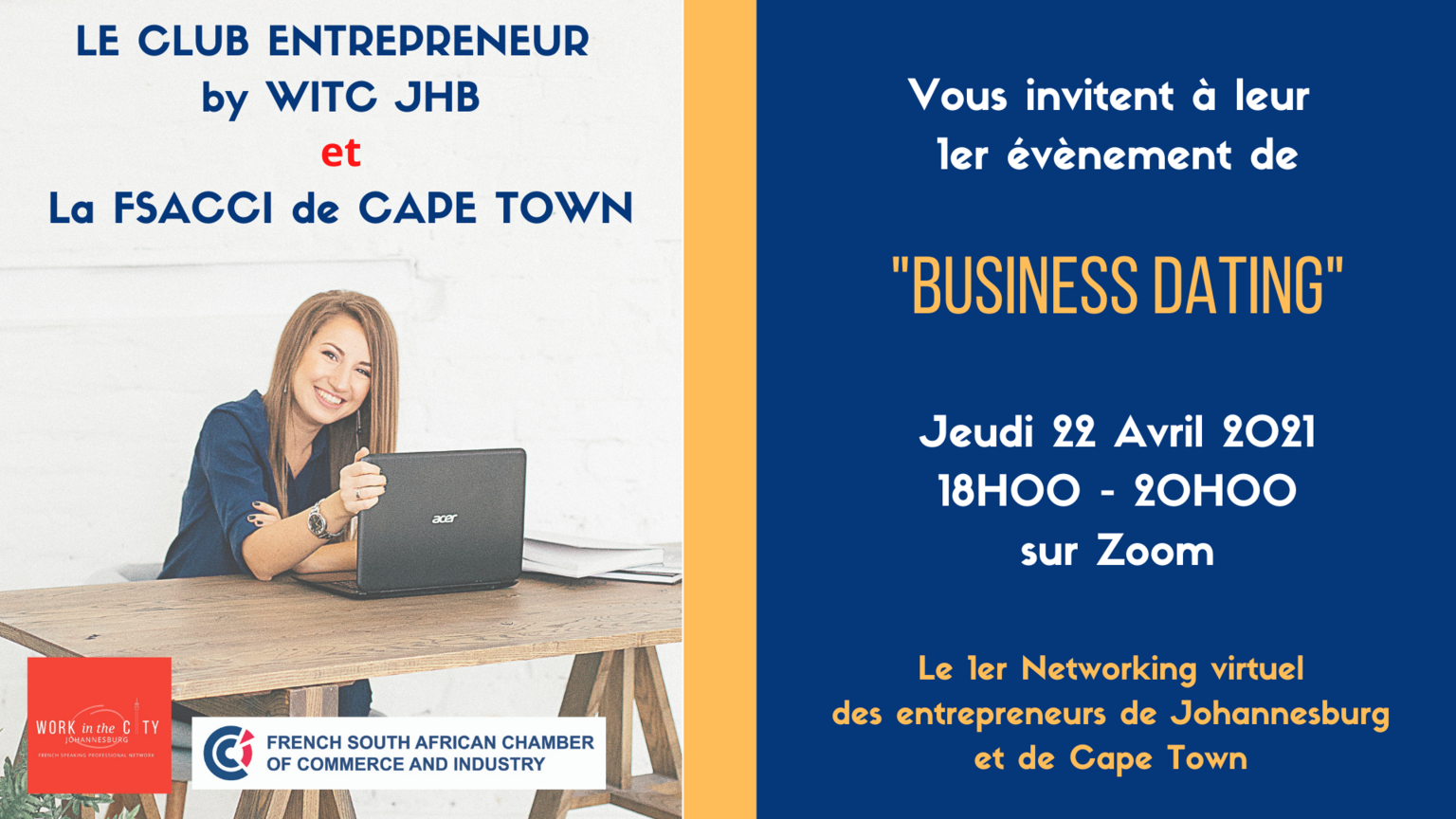 Le Club Entrepreneur by WITC JHB and the FSACCI of Cape Town are pleased to invite you to the 1st Virtual Networking of Entrepreneurs from Johannesburg and Cape Town around a "Business Dating" on Thursday, April 22 via Zoom from 18:00 pm to 20:00.