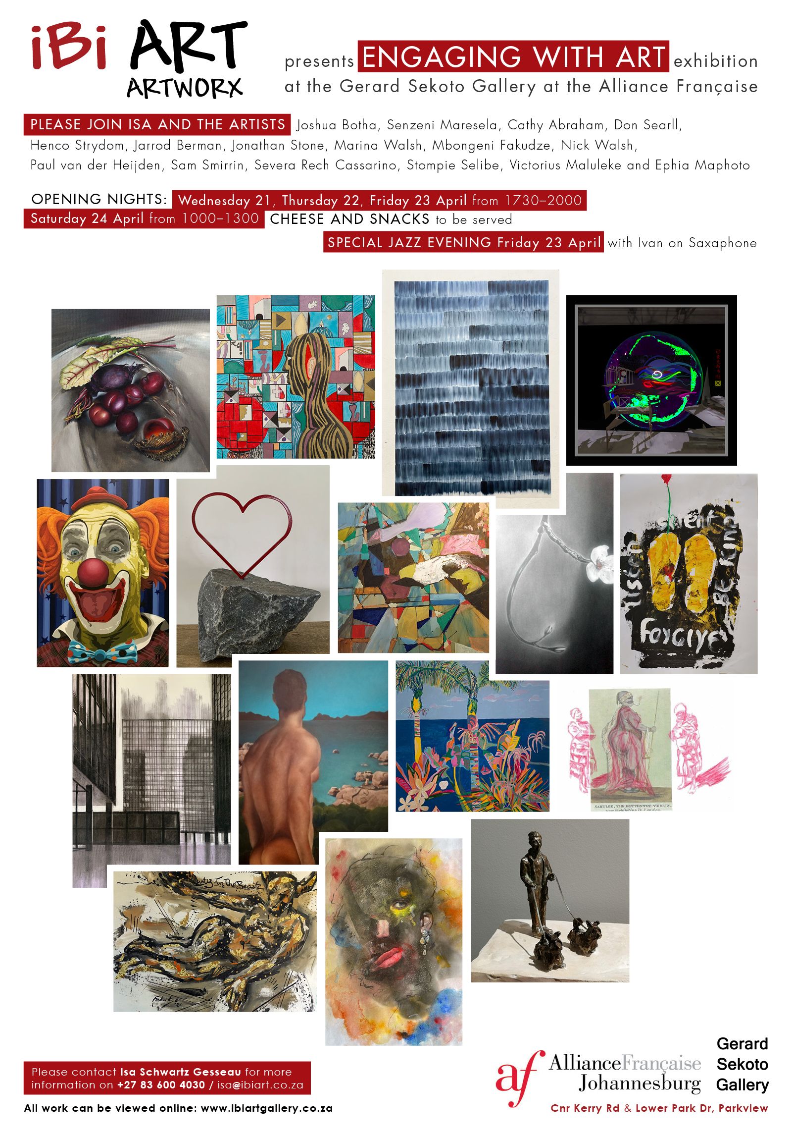 Joshua Botha; Senzeni Maresela; Cathy Abraham; Don Searll; Henco Strydom; Jarrod Berman; Jonathan Stone; Marina Walsh; Mbongeni Fakudze; Nick Walsh; Paul van der Heijden; Sam Smirrin; Severa Rech Cassarino; Stompie Selibe; Victorius Maluleke; and Ephia Maphoto. The artists will also be joined by Ivan on Saxophone for a special jazz evening on Friday April 23rd.