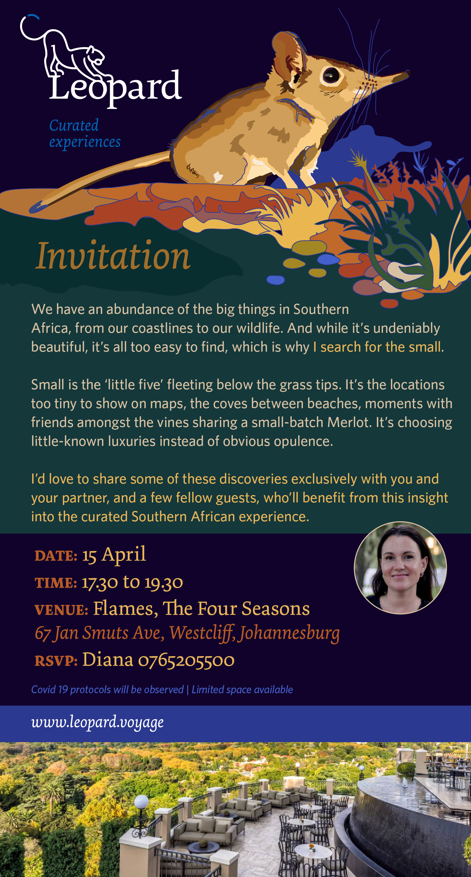 Join Leopard Voyage's Diana Granoux as she shares with you South Africa's minute but precious locations which may be too tiny to show on maps; may be the coves between beaches; or moments with friends amongst the vines sharinng a small-batch Merlot.