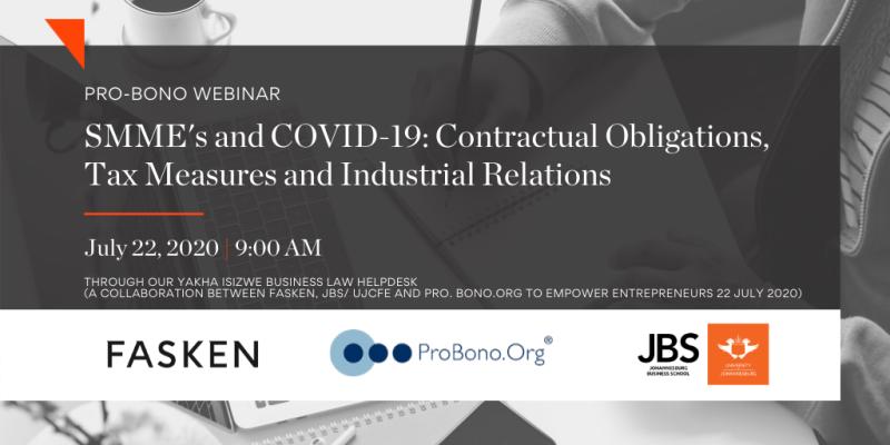 FASKEN presents, through Yakha Isizwe Business Law Helpdesk, a Pro Bono Webinar for SMME’s on COVID-19. This is a collaboration between Fasken, UJCfE and ProBono.Org to empower entrepreneurs. Fasken senior associate Shadi Kekana, associate Nicholas Ndlovu, as well as candidate attorneys Johan Coertze, Barr-Mary Tyzack and Wesley Fletcher as they cover areas such as contractual obligations, tax measures and industrial relations.