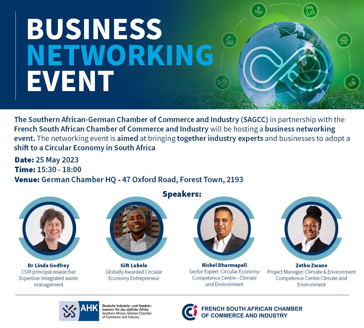The French South African Chamber of Commerce & Industry along with the Southern African-German Chamber of Commerce and Industry (SAGCC) cordially invites you to a business networking event.