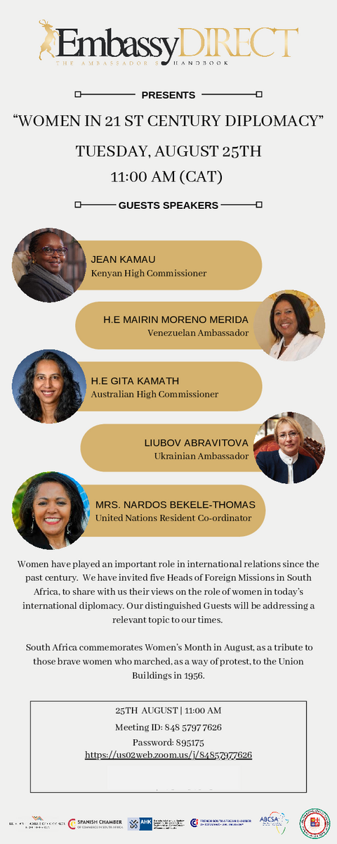 Women have played an important role in international relations since the past century. We have invited five Heads of Foreign Missions in South Africa, to share with us their views on the role of women in today’s international diplomacy. Our distinguished Guests will be addressing a relevant topic to our times. South Africa commemorates Women’s Month in August, as a tribute to those brave women who marched, as a way of protest, to the Union Buildings in 1956.