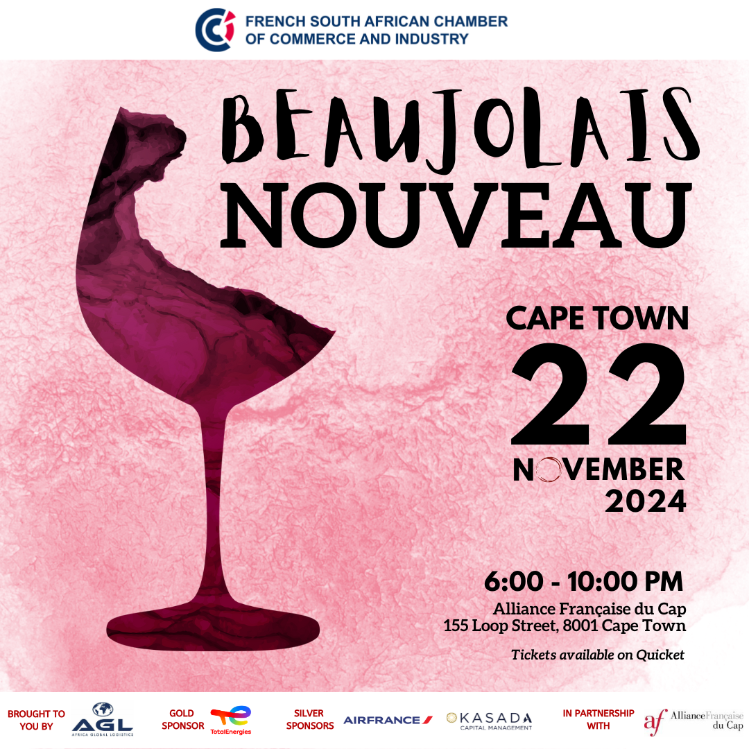 The Annual Beaujolais Nouveau celebration is back in Cape Town on Friday, 22nd November 2024. This event is a fantastic opportunity for the French and South African business communities to come together, build valuable connections, and enjoy a night of wine, food, and fun.