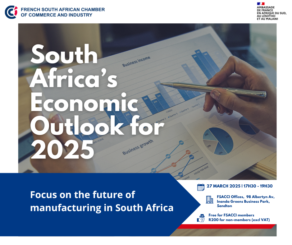 FSACCI, in collaboration with the Department of Economic Affairs for Southern Africa at the French Embassy, is thrilled to host South Africa’s Economic Outlook 2025, with a special focus on the future of manufacturing in the country.