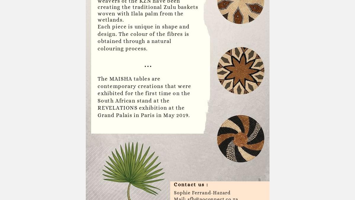For several generations, master weavers of the KZN have been creating the traditional Zulu baskets woven with Ilala palm from the wetlands. Each piece is unique in shape and design. The colour of the fibres is obtained through a natural colouring process.
