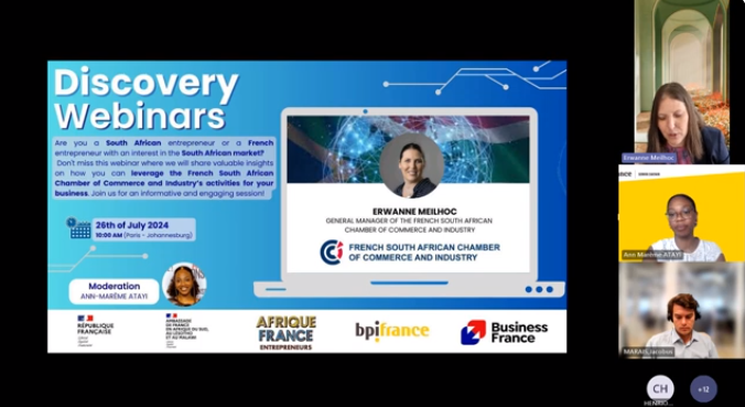 The webinar is organized by AFRIQUE FRANCE Entrepreneurs, moderated by Ann-Mareme Atayifrom Banque publique d'investissement (BPI) France with FSACCI General Manager, Erwanne Meilhoc, as a key speaker and intervention from Business France and BPI.