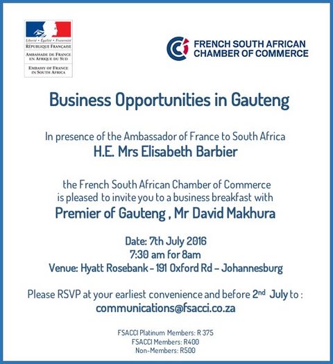 Please RSVP at your earliest convenience and before 2nd July to : communications@fsacci.co.za
