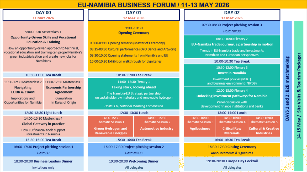 The EU–Namibia Business Forum will take place in Windhoek from 11 to 13 May 2026. The event will focus on Green Industrialisation, Critical Raw Materials, Automotive Manufacturing, Cultural and Creative Industries, and Agribusiness.