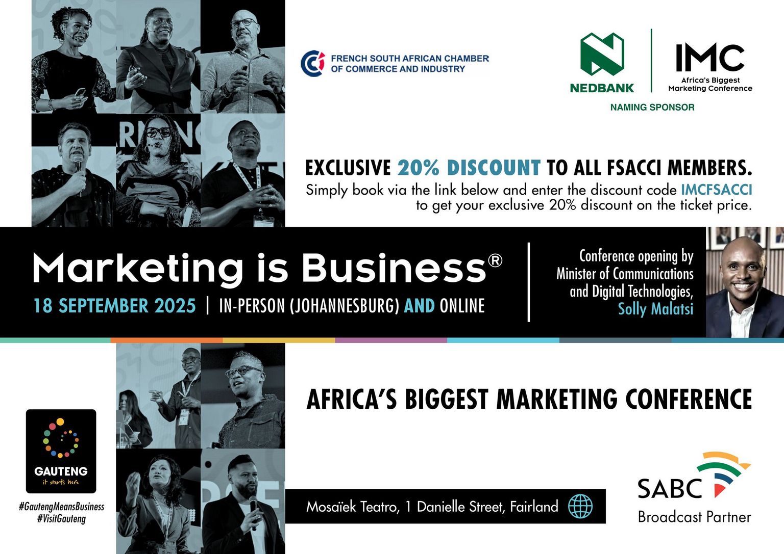 Nedbank, naming sponsor of the conference, is a member of the French South African Chamber of Commerce and Industry (FSACCI). FSACCI is among the chambers supporting the conference, which is endorsed by several leading industry associations. FSACCI members can access an exclusive 20% discount on ticket prices by entering the code IMCFSACCI when booking.