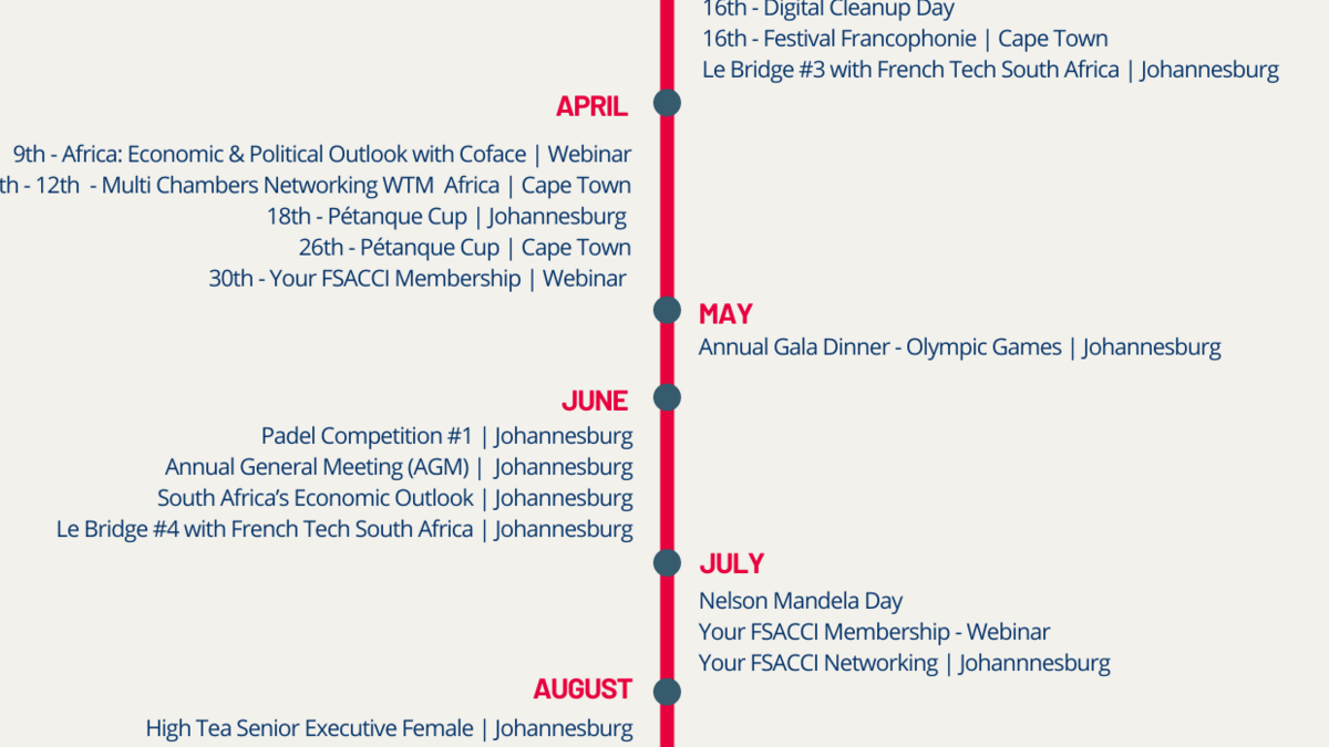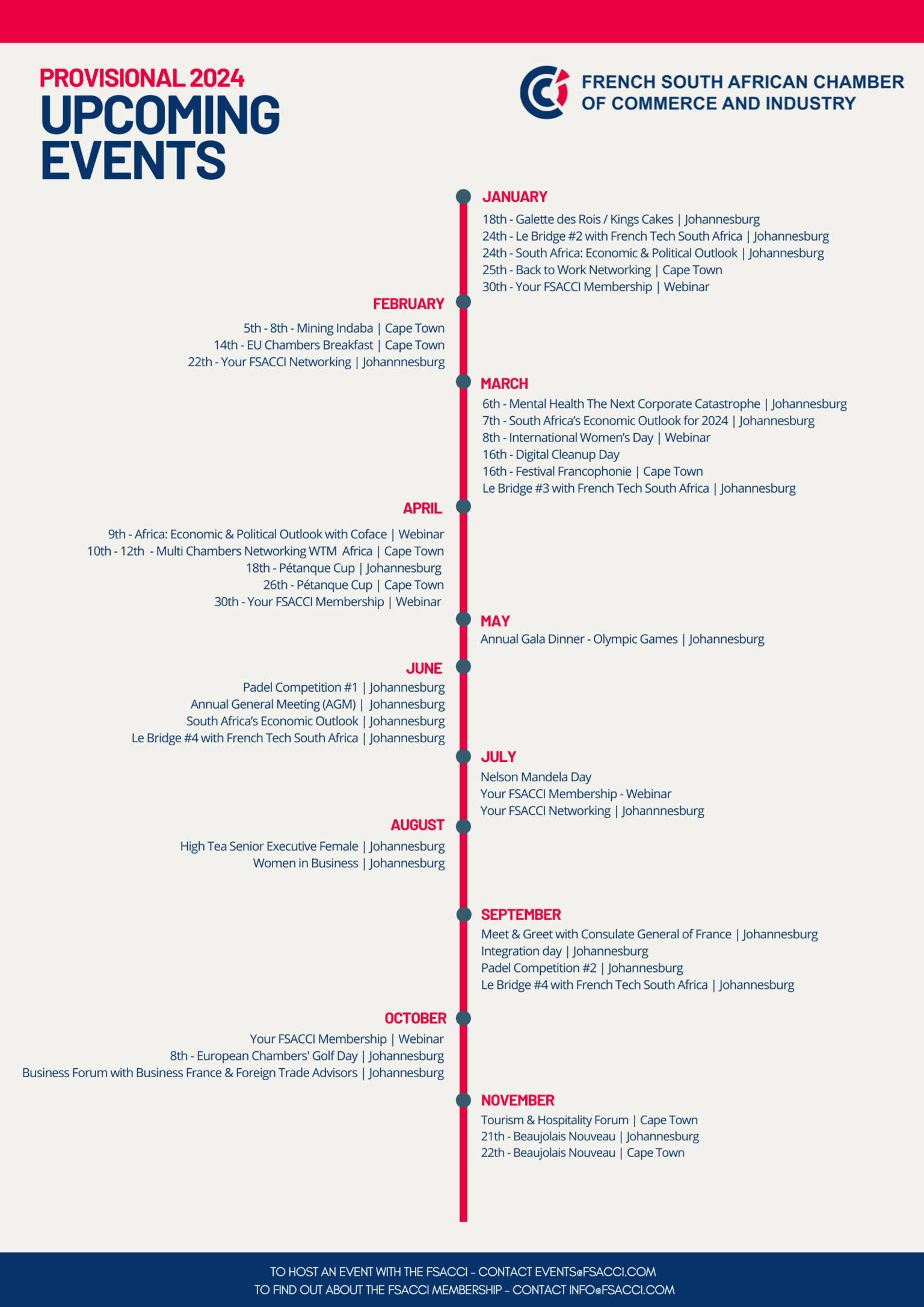 The French South African Chamber of Commerce and Industry (FSACCI) is thrilled to announce a dynamic roster of provisional events for the year 2024.