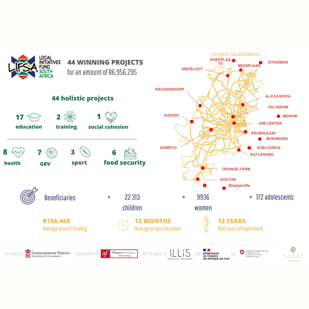The Local Initiatives Fund South Africa (LIFSA) is an initiative of the Government of Monaco in partnership the Alliance Française de Johannesburg, with the support of the French Embassy in South Africa, the Embassy of Switzerland in South Africa and the Saxon Hotel. LIFSA is open to the private companies who would like to invest in a turnkey CSR program.