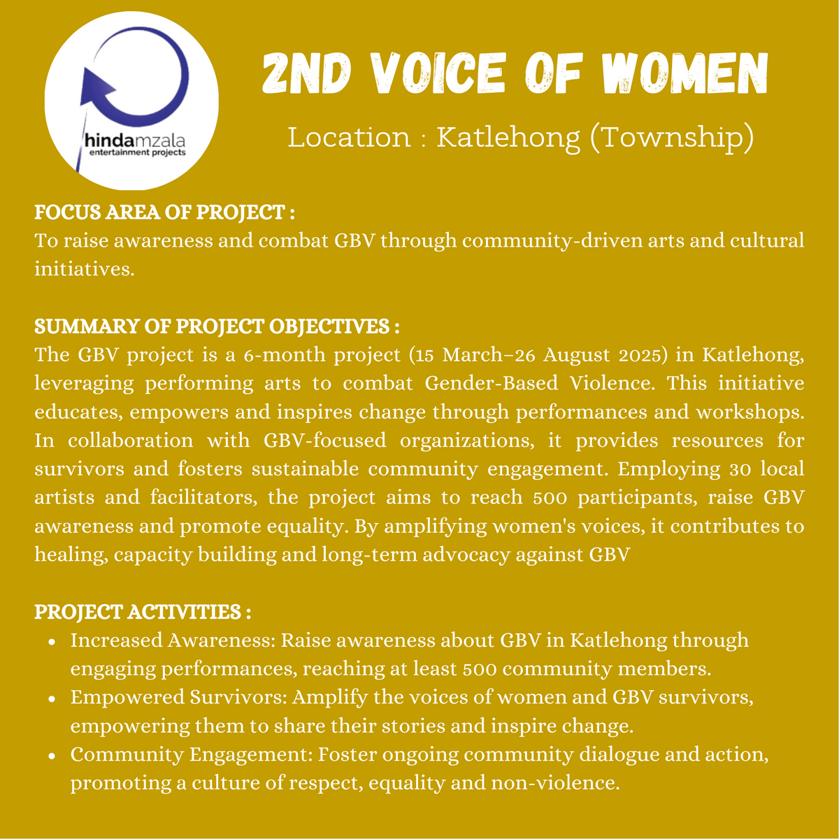 ?HINDA MZALA ? The Voice of the Women - Raising awareness and fighting against gender-based violence through art and culture. Objective: to reach 500 members of the Katlehong community and amplify the voices of survivors.