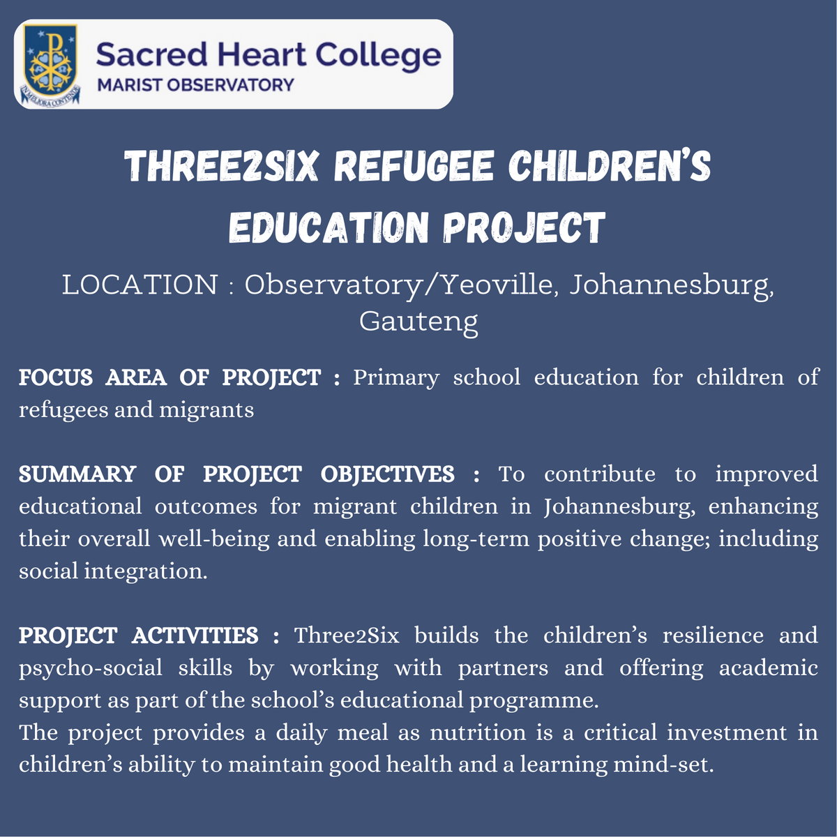 ? SACRED HEART COLLEGE? Three2Six Refugee Children's Education Project – Improving learning conditions for refugee and migrant children in Johannesburg, with psychosocial support and a food program.