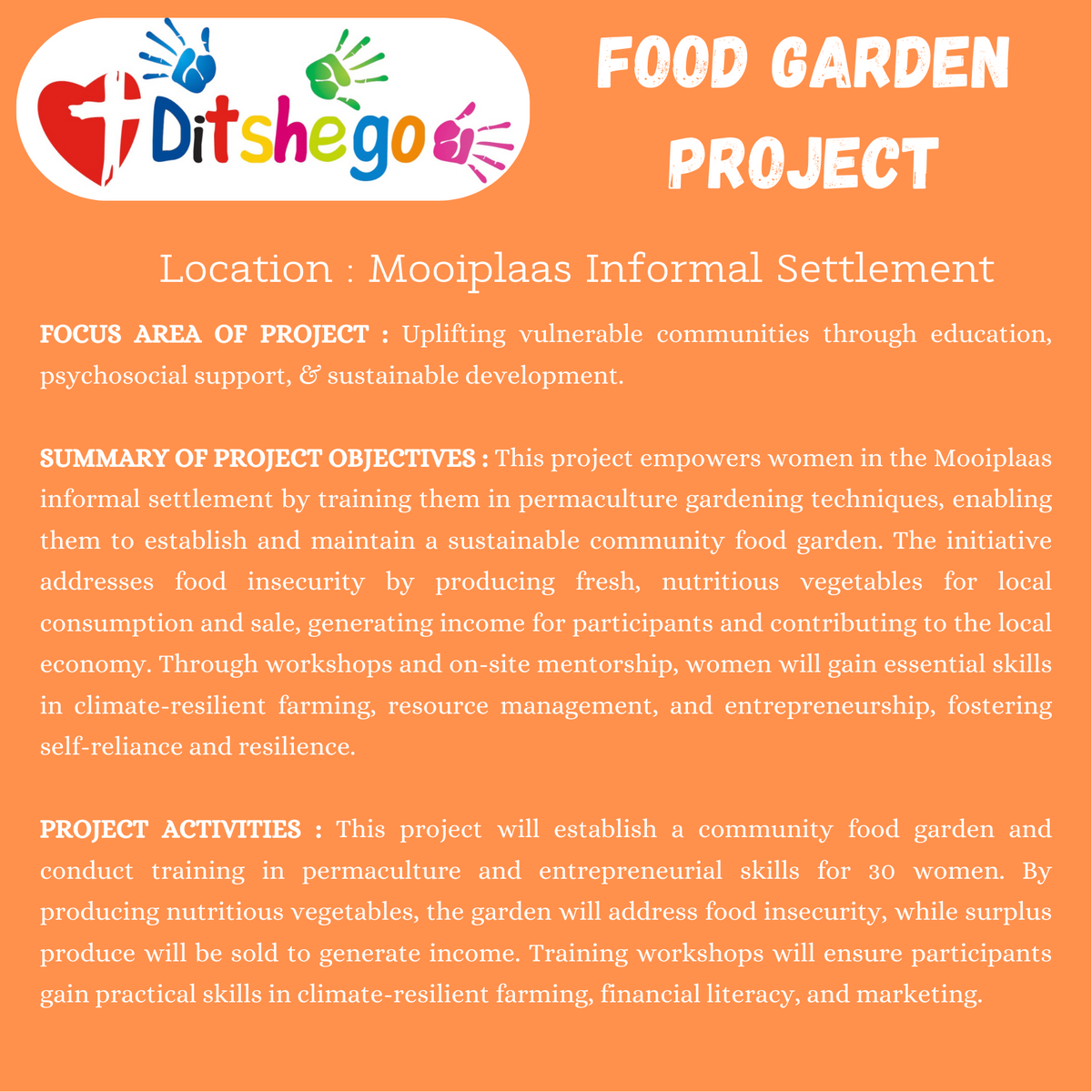 ? DITSHEGO ? Food Garden Project – Training of 30 women in permaculture and resource management in Mooiplaas to combat food insecurity and promote economic independence.