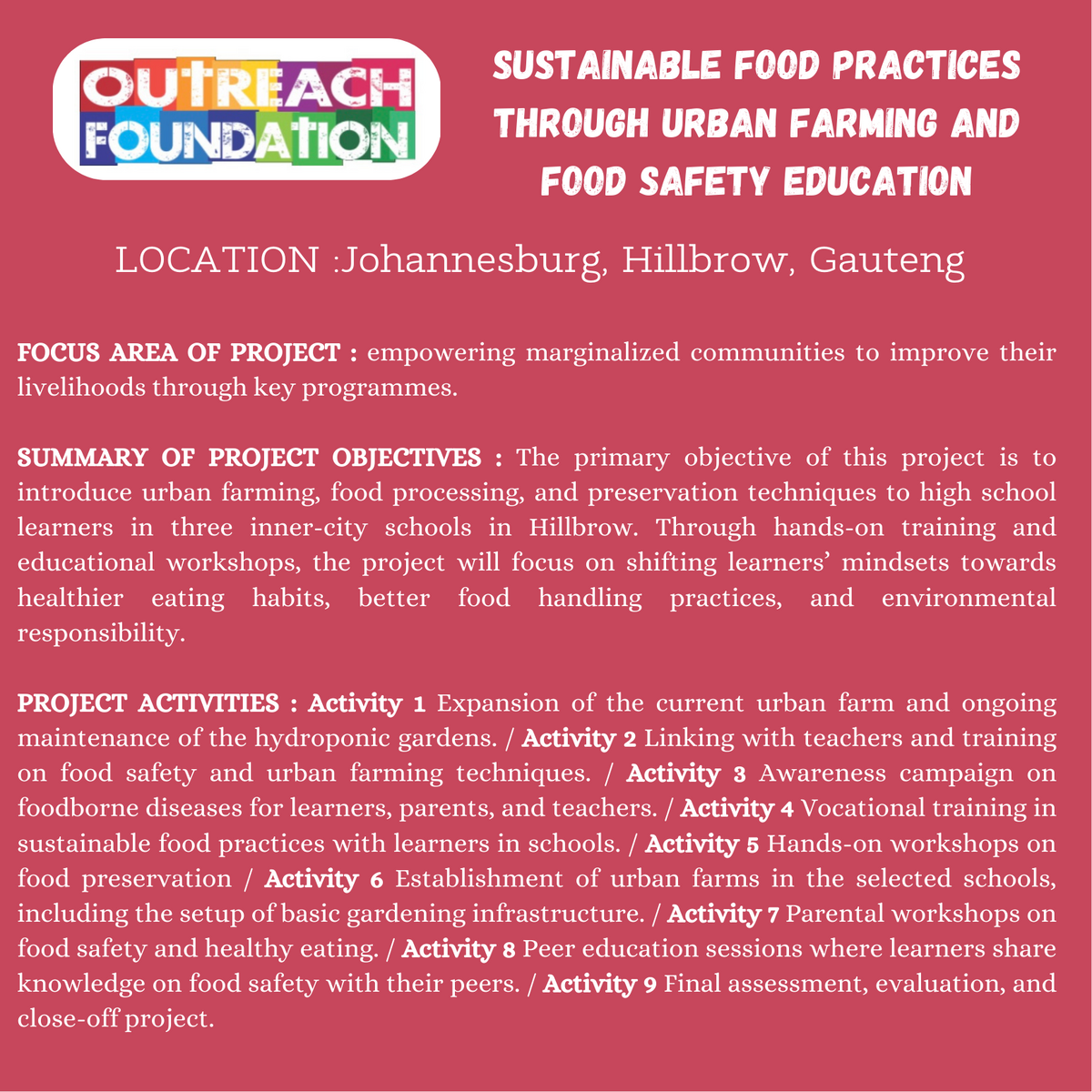 ? OUTREACH FOUNDATION ? Sustainable Food Practices through Urban Farming and Food Safety Education – Introduction of sustainable urban agricultural techniques in three schools in Hillbrow, Johannesburg, to encourage better eating habits and raise awareness of food safety.