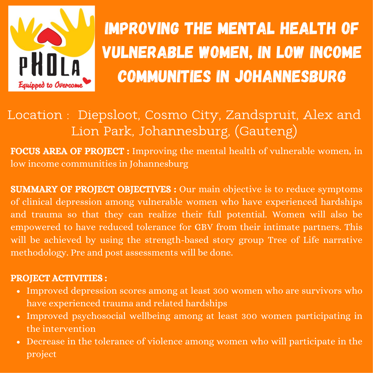 ? PHOLA ? Improving the Mental Health of Vulnerable Women – Reduction of symptoms of depression in 300 women survivors of violence and trauma in five disadvantaged neighborhoods of Johannesburg.