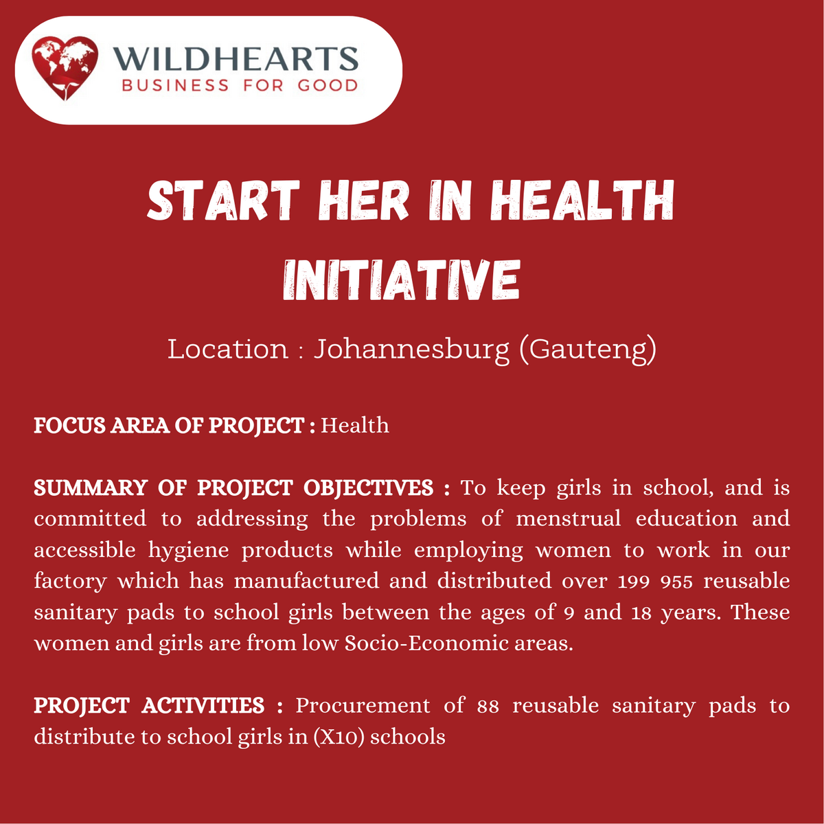 ? WILDHEARTS? StartHer in Health Initiative – Provision of 199,955 reusable sanitary pads to enable girls to stay in school, while employing women from disadvantaged backgrounds.