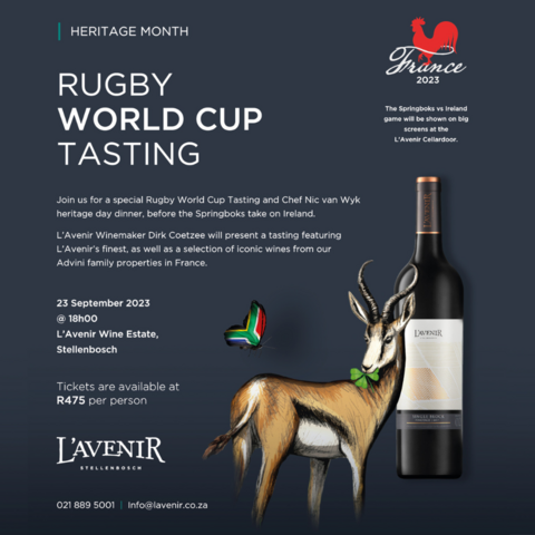 Our member L'Avenir Wine Estate is offering a Rugby World Cup Tasting and Heritage Braai Menu by Chef Nic van Wyk on Saturday, September 23rd at 6 PM before Springboks-Ireland.