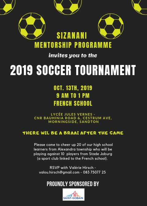 Sizanani invites you and your friends and family to attend a soccer tournament followed by a braai on Sunday 13th of October, from 9am to 1pm at the Lycée Jules Verne.