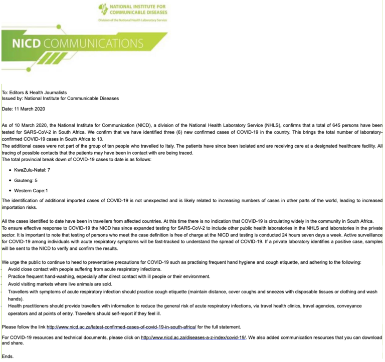 For more information: Full statement: http://www.nicd.ac.za/latest-confirmed-cases-of-covid-19-i…/ Resources and documents to…