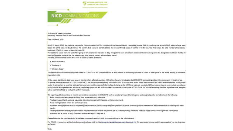 For more information: Full statement: http://www.nicd.ac.za/latest-confirmed-cases-of-covid-19-i…/ Resources and documents to…