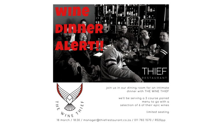 The Thief Restaurant and Wine Thief are getting together to host you for a wine-tasting on Wednesday 18 March at 18:30. Not only are they stealing…