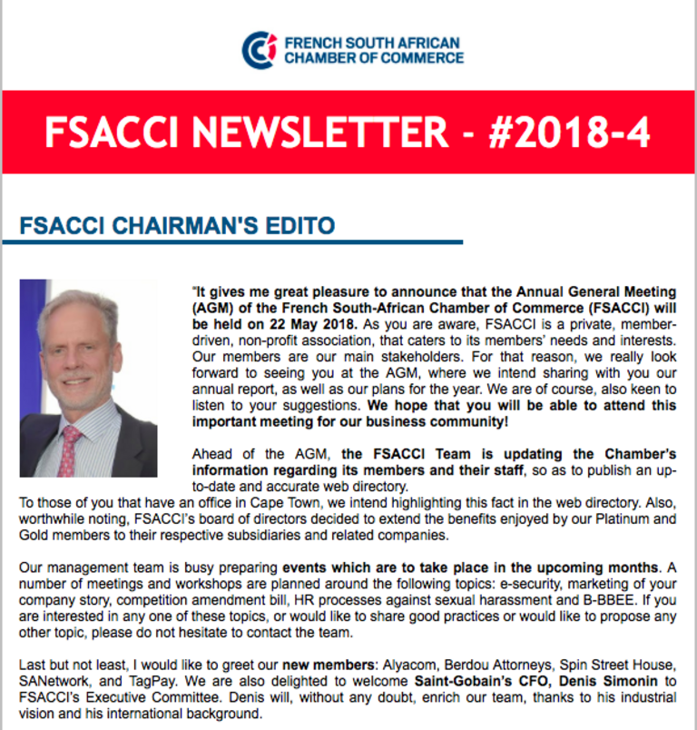 The French-South African Chamber of Commerce and Industry offers you various platforms and solutions to communicate with its members and the French-South African business community!