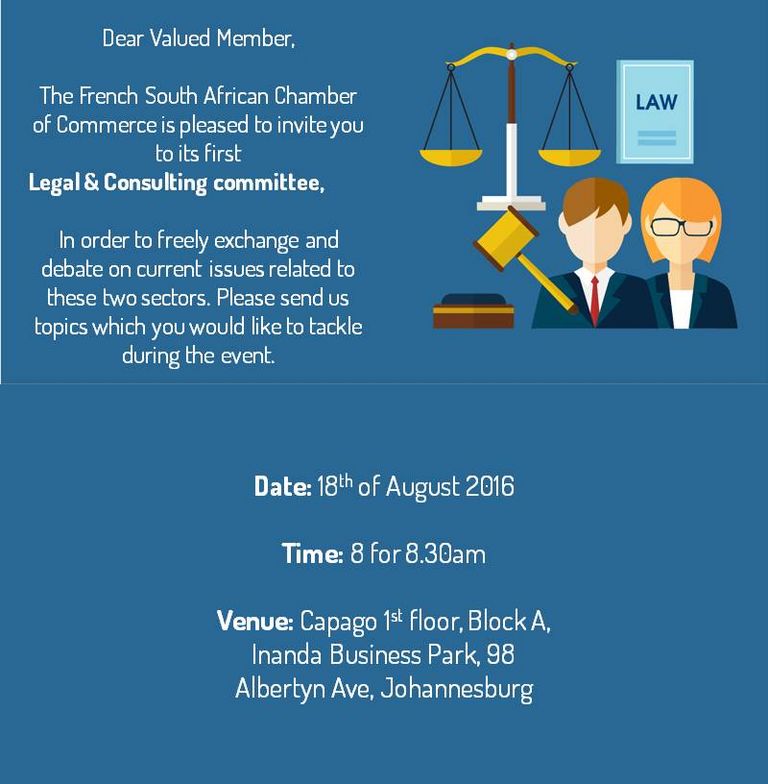 The French South African Chamber of Commerce is pleased to invite you to its first Legal & Consulting committee