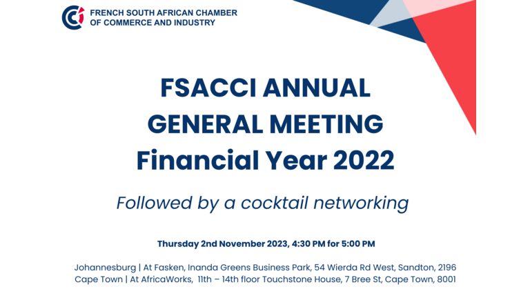 The French South Africa Chamber of Commerce and Industry invites all its members, in good standing, to take part in the up upcoming Annual General…