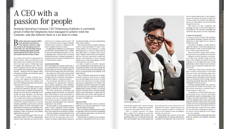 Nthabiseng Kubheka, the CEO of Bombela Operating Company (BOC), that maintain and operate the Gautrain – was featured in this month’s issue of…